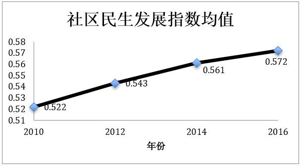 为全面衡量和分析我国社区基层民生的变化情况,2017年,在国家社科基金“社区民生监测与社区治理研究”项目支持下,本课题组利用2010年基线调查数据及2012年、2014年和2016年追踪调查数据,建立起中国社区民生发展指数,指标体系包括了“创新、协调、绿色、开放、共享”这五大方面14个维度40个变量。研究选取了CFPS四轮调查中均有受访家庭的共549个村居以及这些村居中的家庭和个人样本,以实现对社区民生发展监测在时间上的连续性。社区民生指数得分在0和1之间。