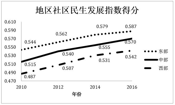 根据图3所示,在社区基层民生建设上,地区之间也存在一定的差距。2010年到2016年,东部社区、中部社区和西部社区的平均得分分别是0.568、0.545和0.517,即东部社区得分最高、中部社区居次而西部社区得分最低。这说明在改善基层民生上,东部社区做得最好,其次是中部社区,而西部社区相对落后。这种梯度特征,与东部、中部和西部的经济社会整体发展程度有关。在改善基层民生状况时,需要综合考虑不同地区的发展情况,因地制宜地实施有针对性的民生改善活动和措施,尽可能确保不同地区的基层民生发展比较平衡,避免出现差距过大的情形。