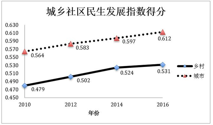 从总体发展趋势来看,无论是城镇社区还是农村社区,从2010年以来,在社区民生发展指数上的得分都呈现出明显上升趋势,上升基本上是同步的。这说明,无论是城镇地区还是农村地区,都在改善和发展基层民生上进行了大力投入,并获得了成效,使得基层民生状况获得了稳步改善。