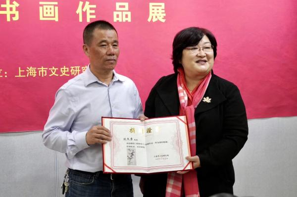“世纪留英——伏文彦书画作品展”由上海文史馆主办,开幕当天,旅居美国的伏文彦由于身体原因虽未出席,但他的家人代表向上海市文史研究馆捐赠了书画作品,文史馆还特此举办了捐赠仪式。“在伏文彦百岁之际,举办这样一个展览也体现了上海市文史馆‘敬老崇文’的办馆宗旨。”主办方在当天的开幕式介绍道。