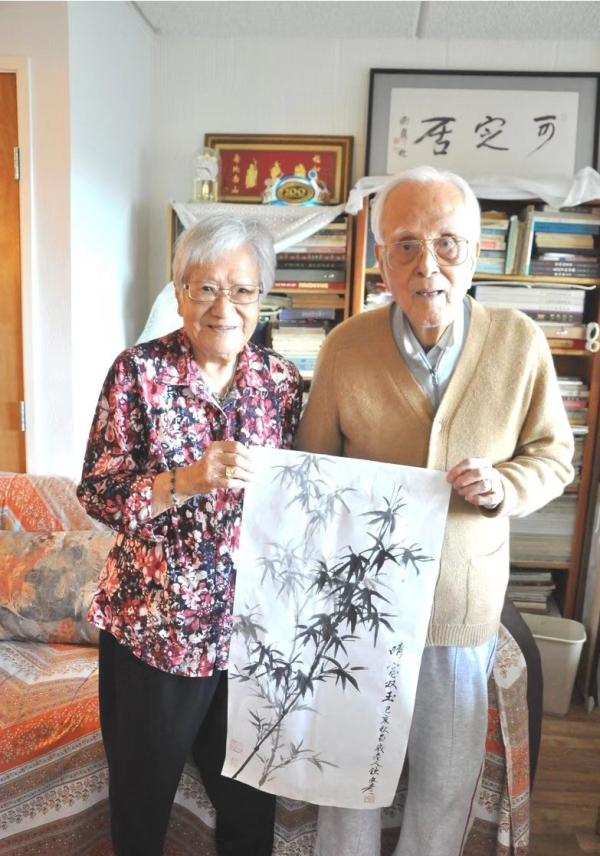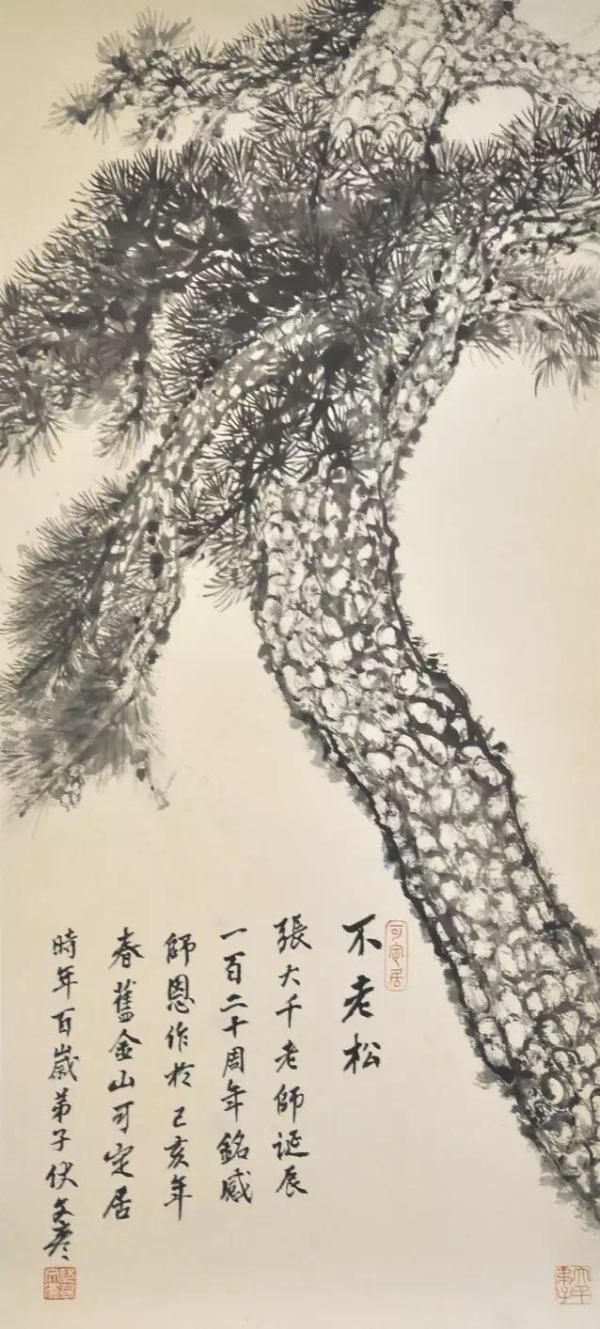 进入展厅左侧,一幅名为《不老松》的书画作品吸引了观者的视线,画面以苍润的笔墨绘孤松遒曲的枝干,再以浓墨点出松针。左下题:“不老松,张大千老师诞辰一百二十周年,铭感师恩,作于己亥年春,旧金山可定居,时年百岁弟子伏文彦。”从中见出伏文彦对恩师张大千的感怀之情。据介绍,伏文彦出国定居后,为感念老师张大千和汪亚尘的恩德,还将画斋定名为“风云楼”,取“大风堂”和“云隐楼”之意。