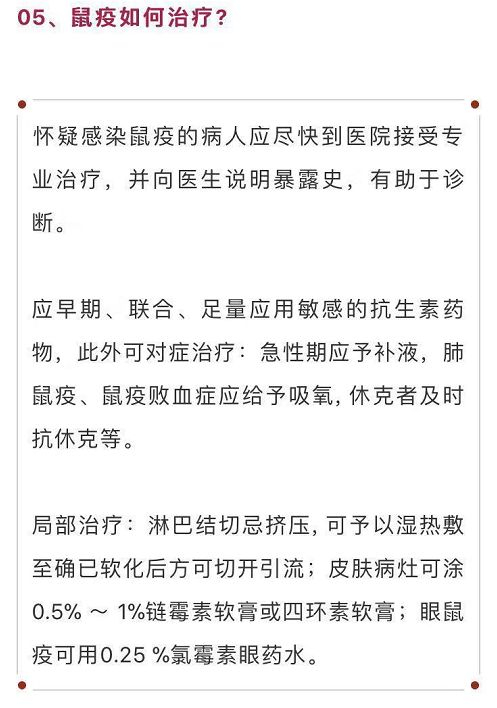 与鼠疫病人密切接触者可预防性用药:四环素1-2克/天,分2-4次口服,儿童25-50毫克/天,分2-4次口服;多西环素100-200毫克/天,1次或分2次口服,儿童剂量及服法相同;磺胺类药(含增效剂)1.6克/天,分2次口服。一般连服5~7天。