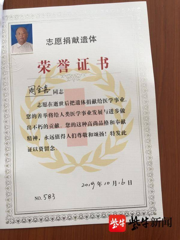 扬子晚报网11月14日讯(记者 张凌发 通讯员 周业 张俊)“我老了,不能为党和国家工作了,希望能够把遗体捐给社会,供医学研究,如器官有用,捐献受供者,让生命得到延续……”近日,家住句容茅山风景区的71岁老党员周金喜,收到了来自镇江市红十字会的“志愿捐献遗体”荣誉证书。