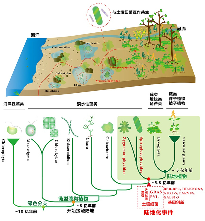 上述这些基因和功能此前一直认为只有陆地植物才特有。研究团队第一次在该研究中将其“祖先的根”追溯到了双星藻纲(Zygnematophyceae)的两个基因组上,并证明其起源于一次从土壤细菌中来的水平基因转移事件(Horizontal Gene Transfer, HGTs);通过分子系统进化分析,发现该HGT事件发生的时间约为5.8亿年前,正好与植物陆地化的化石时间吻合。
