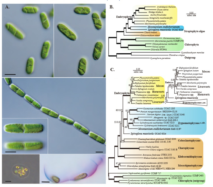通过系统分类与比较进化基因组学研究,证实了其中之一的绿藻:Spirogloea muscicola,为首次报道且来源于一个新鉴定分类属(Spirogloeophycidae)的新物种;并进一步证明Spirogloea muscicola是双星藻纲(Zygnematophyceae)最早分化出来的最接近陆地植物共同祖先的基部物种。