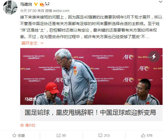 著名足球记者马德兴也在个人社交媒体上发布相关消息,他认为里皮在输球后选择辞职无疑有“甩锅”的嫌疑。