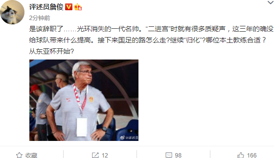 著名足球评论员詹俊说:是该辞职了……光环消失的一代名帅。“二进宫”时就有很多质疑声,这三年的确没给球队带来什么提高。接下来国足的路怎么走?继续“归化”?哪位本土教练合适?从东亚杯开始?