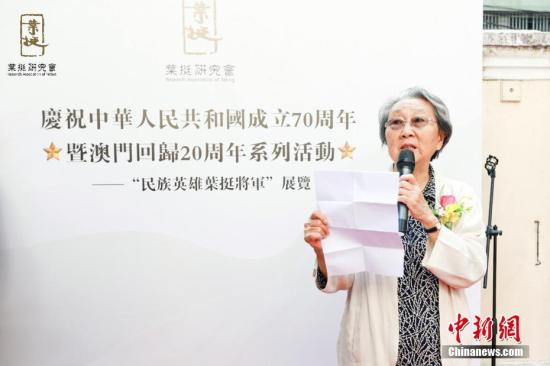 11月15日,由《人民日报·海外版》、广东省惠州市人民政府及澳门叶挺研究会合办的“民族英雄叶挺将军展览在澳门叶挺故居举行。图为周恩来侄女周秉德代表烈士后人致辞。中新社发 钟欣 摄