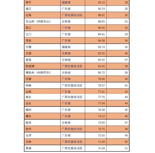 值得关注的是,位居云贵高原的一些城市在评价中也表现较好。如西双版纳州(州府景洪)位居第 18, 黔东南州(州府凯里)位居第 19,黔南州(州府都匀)位居第 21, 红河州(州府蒙自)位居第 24,黔西南州(州府兴义)位居第 25,排名都在 51 个城市的前 50%。 这些位置相对偏远的少数民族地区,虽然交通和医疗条件不具优势,但以其温暖的冬季气候,独具魅力的自然或人文风光等优势获得了较好的综合评价。