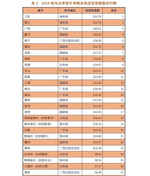 图说:2019 候鸟式养老冬季栖息地适宜度指数排行榜 来源/研究团队供图