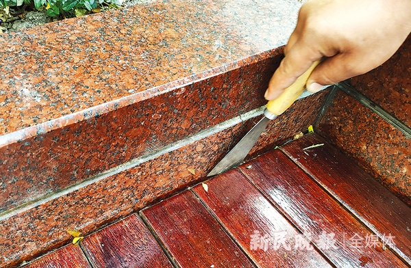 图说:保洁人员用小铲子铲掉椅子缝里的小垃圾。周馨 摄