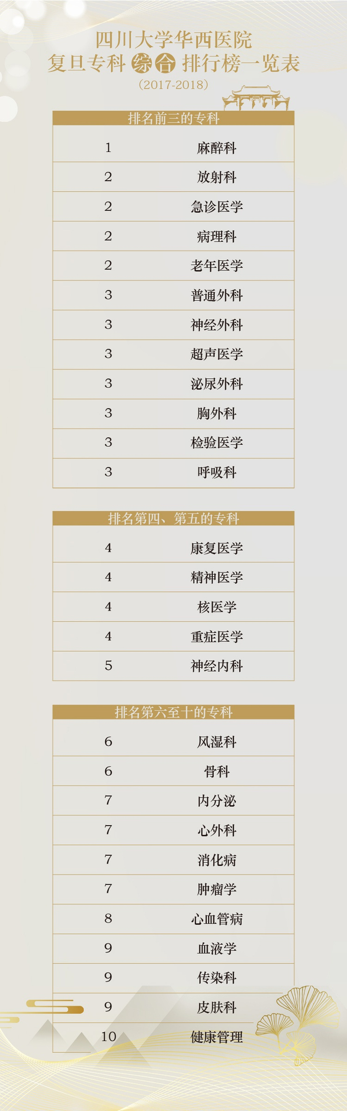 10日下午,复旦大学医院管理研究所高解春所长正式发布“2018年度中国医院排行榜”。华西医院连续十年位列综合排名第二位(总分84.326),其中科研连续十年得分满分排名首位。排名前三的分别是北京协和医院、四川大学华西医院和中国人民解放军总医院。在专科综合排行榜上,华西医院麻醉科排名第一,放射科、病理科、急诊医学、老年医学排名第二,有12个专科排名前三,有17个专科排名前五,有28个专科排名前十;在专科声誉排行榜上,麻醉科连续十年排名第一,放射科和急诊医学排名第二,有9个专科排名前三,有17个专科排名前五,有28个专科排名前十。
