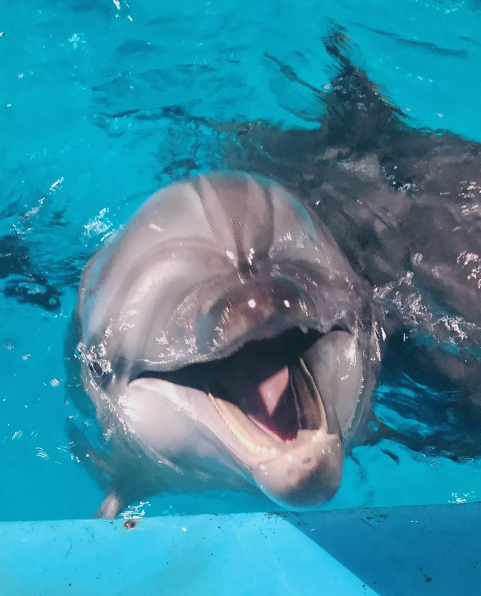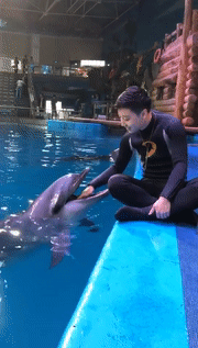 有一次,我站在池边,它非常兴奋地向我游过来,下意识地就把我往水里拽,我当时没反应过来,有点慌,连忙往后退了两步。它看到我的反应后,很失落地游走了。后来我才意识到,它可能只是想找我跟它一起玩,我也能感觉到,它也有点小失落,于是,我就找机会走近它,用手去抚摸它,它好像是知道我的心一样,用小脑袋顶着我的手,摆动着它的双鳍,给我回应。自那时起,我就知道,我们成为了好朋友。