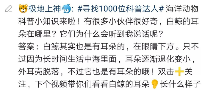 起初,我只是把和它相处的每一天当做最后一天来记录,当作是给自己的一个回忆,但没想到真正上传到网络后,竟然收到很多人的关注和他们的评论,他们来自天南海北,有的甚至从来没有看过海,没有见过海豚,这让从小在海边长大的我感到诧异,我开始感到自己有了除了记录分享以外更多的责任,我开始做起了网络直播,并在直播间里和他们分享一些常识,聊聊海洋知识、进行一些海洋动物的科普,比如企鹅是如何孵蛋的、海豚有多少颗牙齿、北极熊都吃什么、白鲸为什么那么白等等。