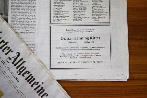 “在每个周五的下午,当我到了咖啡店时,汉宁·里德(Henning Ritter)总是已经在那儿了。我在门口稍作逗留,好仔细观察他。他埋首于文稿中,全神贯注,像是有个无形的罩子将他与四周的人隔绝开来。他的手中握着支铅笔,他的阅读总是立即转化成批注和评论。过了一会儿,他抬起头看到我,露出那特有的诙谐坏笑。”2013年6月23日,六十九岁的汉宁·里德因病在柏林去世后,他的友人、法兰克福作家马丁·莫泽巴赫(Matin Mosebach)如此回忆道。