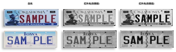 使用白光和红外光拍摄的车辆牌照效果。世界上使用红外图像识别车牌技术的国家早已超过100个,识别率也很高。图中的改善技术指牌照材料对光波的反应技术。