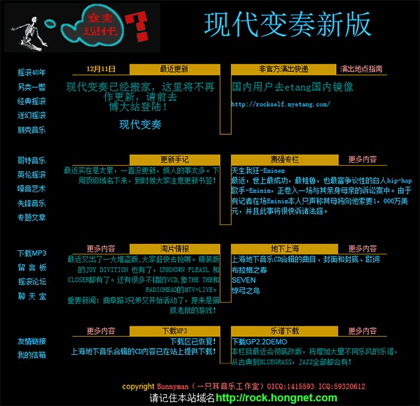 最初的“现代变奏”,只是一个静态页面,挂了一些从杂志上扒下来的摇滚乐文章。章志强当时在“梦想家中文网”工作,单位配备了专业的打字员,他经常拿了一叠《音像世界》杂志,给人家布置课外作业。有了网站,还想做社区。他之前在“高地音乐网”玩,对“高地”的BBS很是羡慕。他先是仿照“高地”的样式,在国外服务器申请了一个差不多风格的BBS,可是网速太慢。碰巧那时候各大门户网站提供免费的BBS空间,他就去乐趣网申请了一个。那是2000年3月,域名使用的是免费空间。