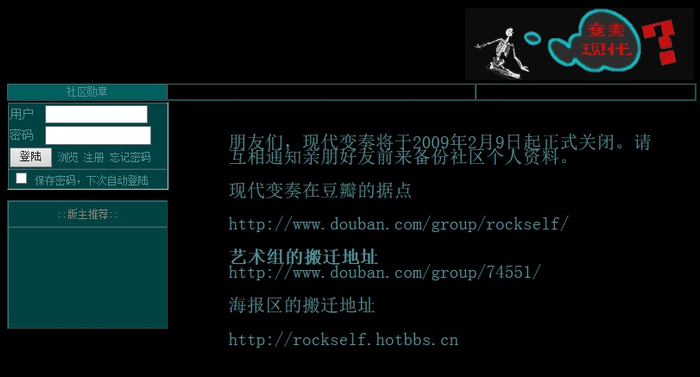 “‘现代变奏’有一个硬伤就是没有程序员。”章志强说。他因为不是做技术出身的,也聘请不起专业人士,网站碰上故障了经常是找朋友客串。就这样一路蒙混到了2009年。这个网站居然做了快十年了,他还蛮感叹的,但是已经没什么人用了。撤退的事情早在一年前开始执行。2008年,网站退了独立的服务器,又回到了互动力量的租用版,每年要交一两千块的租金。“我自己就在琢磨,还要不要花这个钱,好像没什么必要了,不是舍不得钱,就是觉得没劲了,既然大家都在豆瓣玩。”