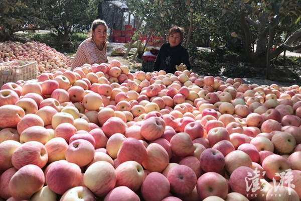 新疆喀什地区泽普县的两名农户将采摘下来的苹果装箱。