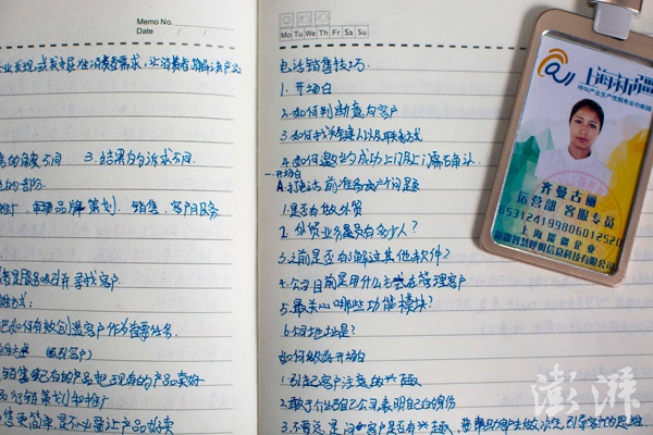 维吾尔族21岁的齐曼古丽的工作证和她的工作笔记。