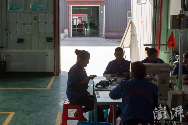 喀什叶城县,几名当地女工在上海产业园阿克塔什分园新奥踏制鞋有限责任公司的流水线上进行鞋子粘合工作。