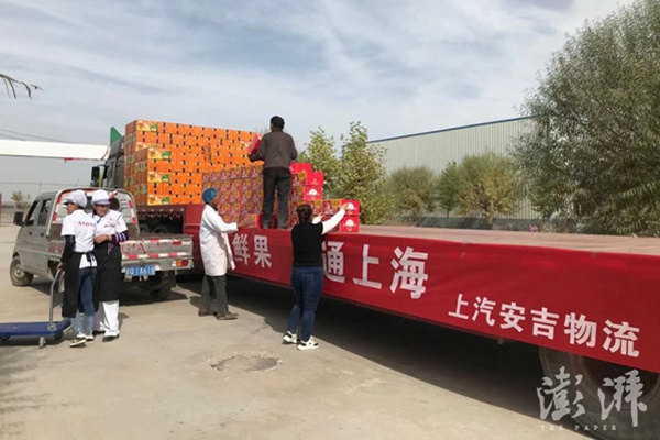 10月17日,新疆泽普县果农将刚刚采摘下来的苹果装上即将发往上海的一辆集卡。