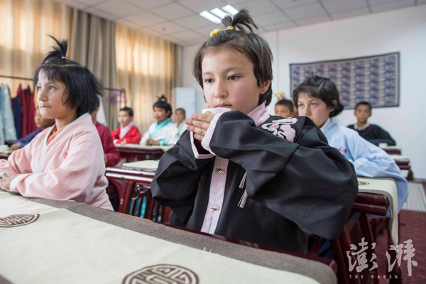 巴楚县第四小学学生妮格热•阿布都艾尼在“小胡杨”市民之家的茶艺礼仪课上品茗。