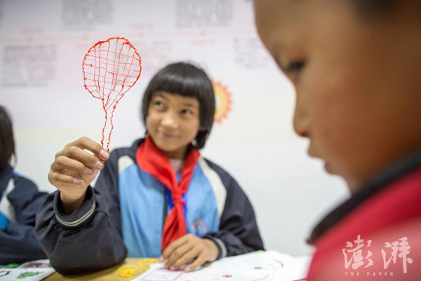 巴楚县第四小学学生阿依夏姑•斯马依力在“小胡杨”市民之家通过3D打印制作网球拍。