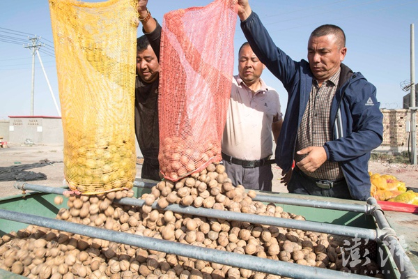 巴楚县绿色天地核桃专业合作社的农民将收获的核桃在放机器中清洗。