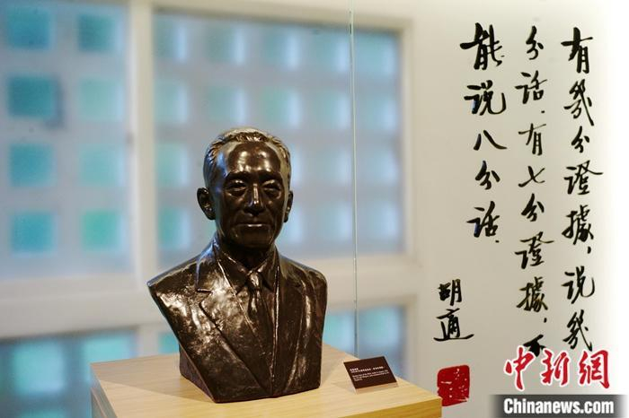 近日,记者到访位于台北市南港区的胡适纪念馆,这里包括胡适公园、故居和陈列室三部分。图为胡适陈列室内展出的胡适铜像。中新社记者 安英昭 摄