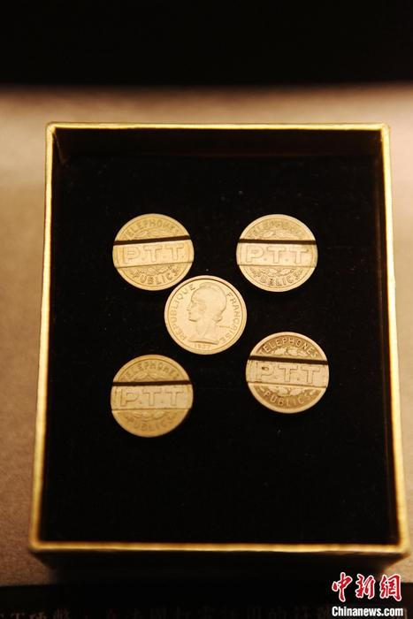 近日,记者到访位于台北市南港区的胡适纪念馆,这里包括胡适公园、故居和陈列室三部分。图为胡适陈列室内展出的旧时法国打电话所用的“PTT”符号币,因为谐音似“怕太太”而成为当时男士自嘲加入“惧内会”的会员证。中新社记者 安英昭 摄