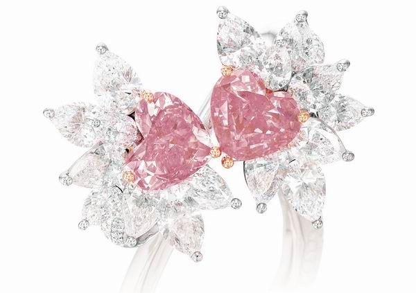 领衔这一系列的拍品是一枚别具设计巧思的戒指,它可以转换成一对耳环,并镶有两颗色泽极佳的心形阿盖尔粉红钻石。众所周知,心形钻石的切割十分困难,而要配对两颗超过一克拉并且粉红色泽与轮廓都均匀的阿盖尔钻石,难度更是超乎想象。