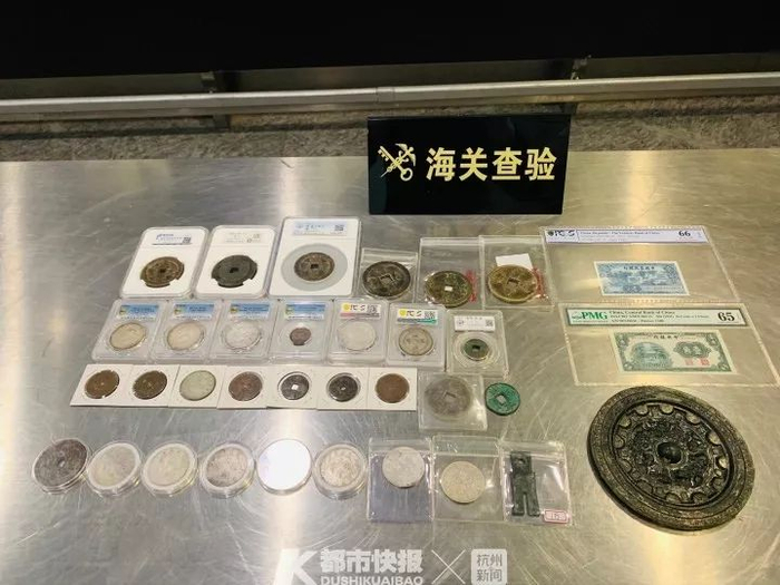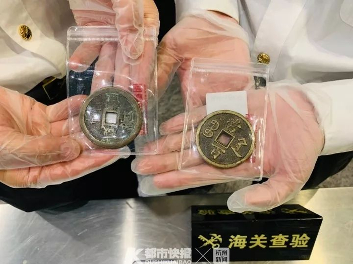 昨天上午,杭州海关所属杭州萧山机场海关关员介绍了其中一起的查获经过。当日,海关关员在执行出境旅客行李监管任务时,一名旅客的行李X光机过机图像引起了他们的注意。图像显示该行李内装有大量圆形带方孔的金属物品,与一般旅客携带硬币的特征并不相符。现场关员根据经验立即对该名旅客的行李进行开箱查验,查获疑似古代钱币39件,随即送专业机构鉴定。最终的鉴定结果证实了关员的判断。