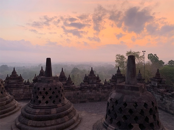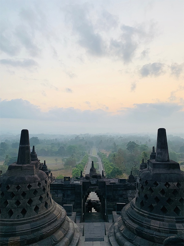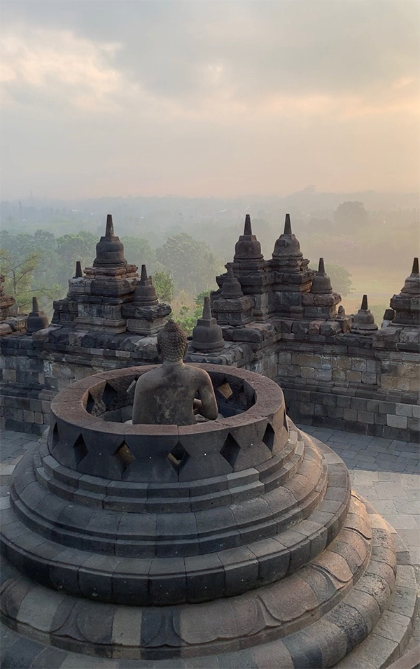 远处薄雾中的丛林和古老的婆罗浮屠佛塔构成了一幅极具东方韵味的油画。