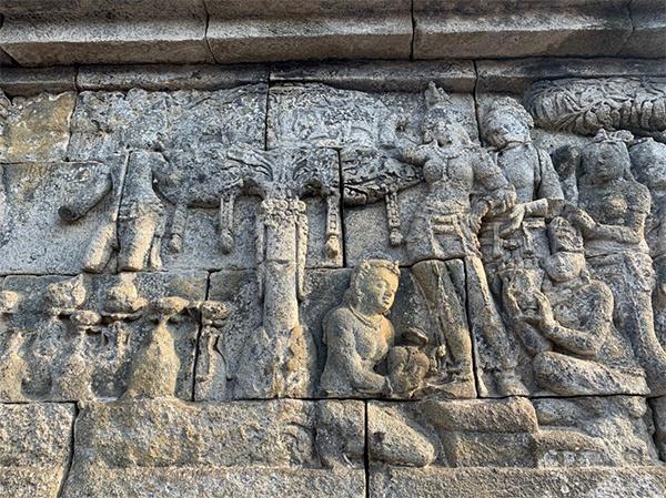 “这里画着佛陀诞生时的故事,说的是佛陀出生后,立行就能在地上行走,每走一步就开一朵莲花,步步生莲。值得一提的是,佛陀的母亲临盆前要回娘家待产,这一传统在爪哇至今还保留。女孩子要回娘家待产生子。”