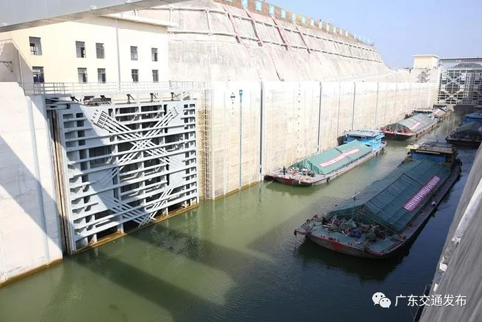 北江项目韶关至清远千吨级船闸通航,标志着北江航道将由V级航道升级为Ⅲ级航道,顺应了运输船舶大型化趋势,消除了船舶过闸拥堵现象,航道通航能力显著提升。