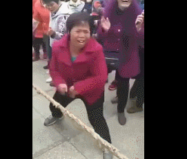 2018年的三八妇女节,广西忻城县红渡镇举行了一场拔河比赛,由于双方势均力敌,比赛一度陷入胶着状态,就在两方选手僵持不下之时,啦啦队的一位大妈开始用力挥舞着双臂,并且大声呐喊着为本方选手加油。