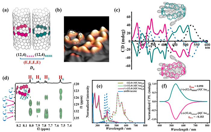 图1. [4]CAn2,6手性碳纳米大环的表征及其性质研究。(a)嵌入在相应碳纳米管中的[4]CAn2,6大环及其手性指数、单体连接单键处的立体构型、所属分子点群; (b) 3D高分辨STM图像;(c) CD光谱;(d) 2D (H, C)-HMBC NMR谱;(e) 紫外及荧光光谱;(f) CPL光谱。