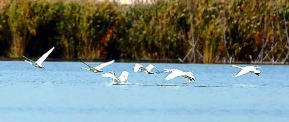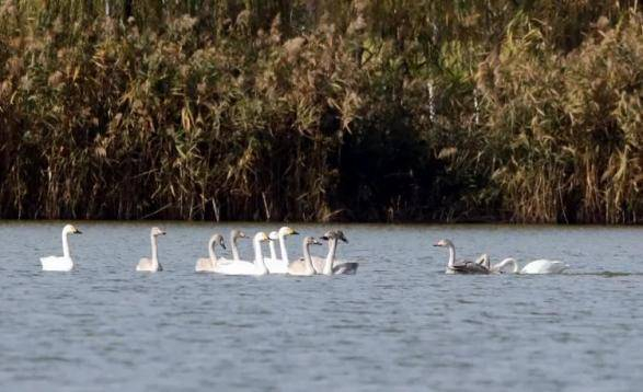 李师傅介绍14日上午9点左右,从西北方向飞来一大批天鹅,它们停留在湖心那片芦苇荡前的水面上,晚上7点多飞走了。