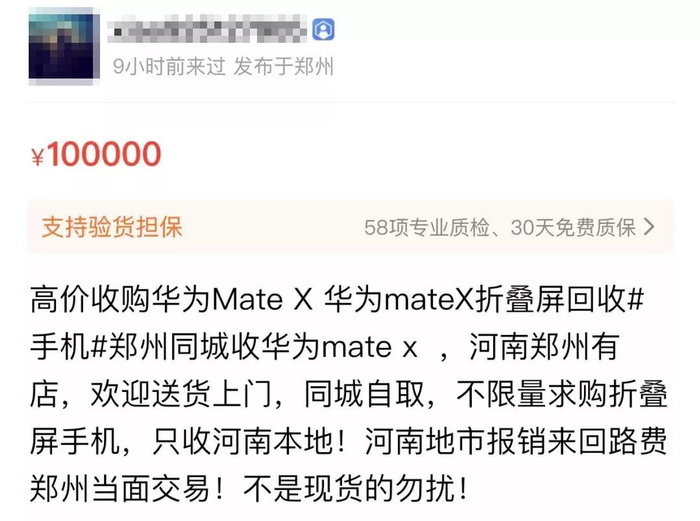 Mate X目前只能在华为商城上购买,类似京东、天猫等电商平台并没有库存可以购买。但在一些二手交易平台,已出现不少MateX的交易帖,大部分存在严重溢价。