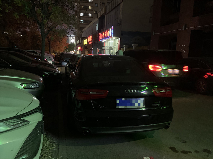 余红回忆,当天下午5点40分左右,她顶着蒙蒙细雨跑到小区楼下准备开车去看电影,她的车停在小区外底商门前的公用车位上。平时,这些车位多是小区业主临时停车用。可到了停车位前,她发现连着三辆车横在车位前,其中一辆黑色奥迪,端端正正挡在自己的车前。