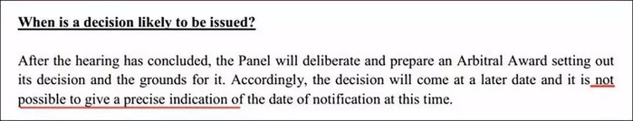 听证会结束了,什么时候出结果呢?总裁法庭的官方文件说“no precise time”(没有精确时间):