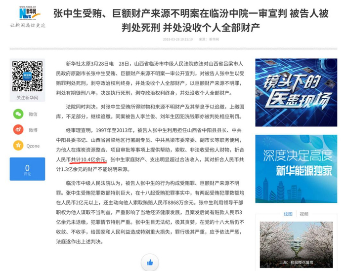 受贿数额比杨思涛高的有山西省吕梁市前副市长张中生。去年三月,山西省临汾市中级人民法院审理查明,张中生索取、非法收受他人财物,折合人民币共计10.4亿余元。