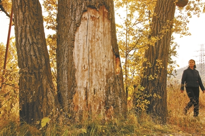 北青报记者发现,仅存遗址的崇化寺萧条冷落,两株高大的古银杏树耸立在山坡上,雄株在西、雌株在东,树高和冠幅均为20米左右,雌株旁还长有一棵树龄略小的古银杏。确如范纪萍所说,这三株古银杏枝叶稀松、树皮焦枯、树冠杂乱、死杈繁多,死杈上的鸟窝仅剩空巢,雌株主干一侧的树皮大片脱落。