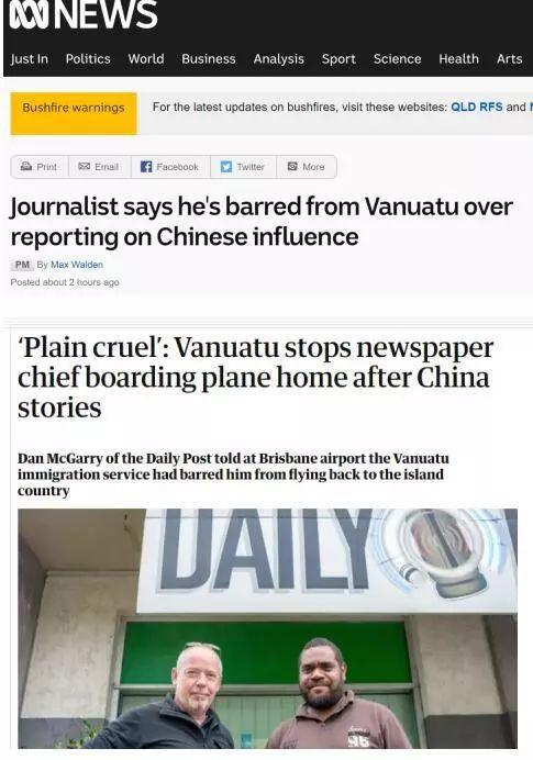 这些西方媒体也“令人毫不意外”地听信了他的说法,在报道里一边将这个Dan描述成是一位捍卫“新闻自由”的斗士,一边则不断炒作瓦努阿图没有新闻自由,中国政府更在渗透这些国家,施加恶劣的影响等等。