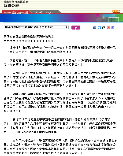 香港特别行政区政府今日(十一月二十日)对美国国会参议院通过《香港人权与民主法案》以及另外一项有关香港的法案表示极度遗憾。