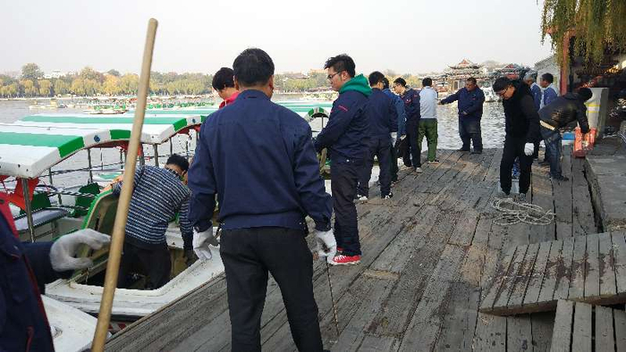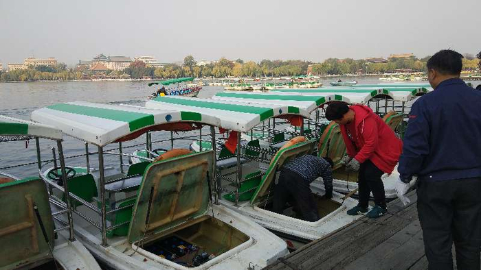 除了颐和园以外,北海公园、陶然亭公园、玉渊潭公园、中山公园和紫竹院公园的所有船只均已停航。在北海公园,400余只游船都已经集中停靠,公园管理处在10处码头及游船停靠区域放置了45个潜水泵,为的是防止游船和码头被冻,造成船只损伤;430余块电瓶船的电瓶全部完成拆卸,送回厂家进行维修和保养。北海公园的工作人员介绍,每天每个码头至少有2名职工在白天进行值守,如果水面结冰,值守人员首先要进行砸冰工作,之后打开潜水泵,检查潜水泵是否正常工作。此外,职工还要清除船只周边的落叶、杂物等,消防安全隐患。