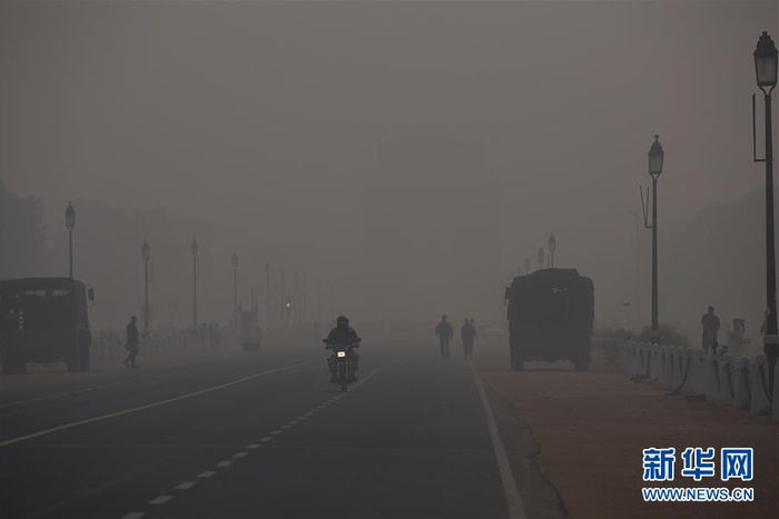11月13日,在印度新德里,人们在雾霾中通勤。 印度首都新德里近日遭遇严重空气污染,能见度低下,城市被雾霾笼罩。 新华社 图