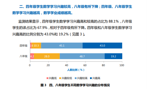 监测显示,四年级学生数学学习兴趣较高,八年级有所下降;四年级、八年级学生数学学习兴趣越高,数学学业成绩越好。