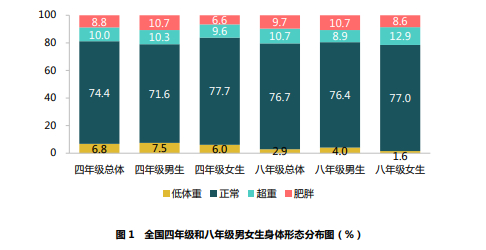 体育与健康监测结果显示:四年级和八年级学生发育整体较好,但存在学生肥胖率、视力不良检出率较高的情况。四年级、八年级学生的肥胖率为8.8%和9.7%,比2015年分别上升了1.9个和2.2个百分点。四年级和八年级学生的视力不良检出率为38.5%和68.8%,分别比2015年上升了2.0个和3.5个百分点。四年级和八年级学生体能达标率分别超过93.0%和85.0%。